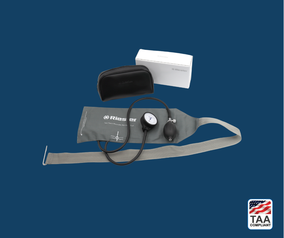 • Metal-housed aneroid sphygmomanometer with adult-size black velcro cuff.