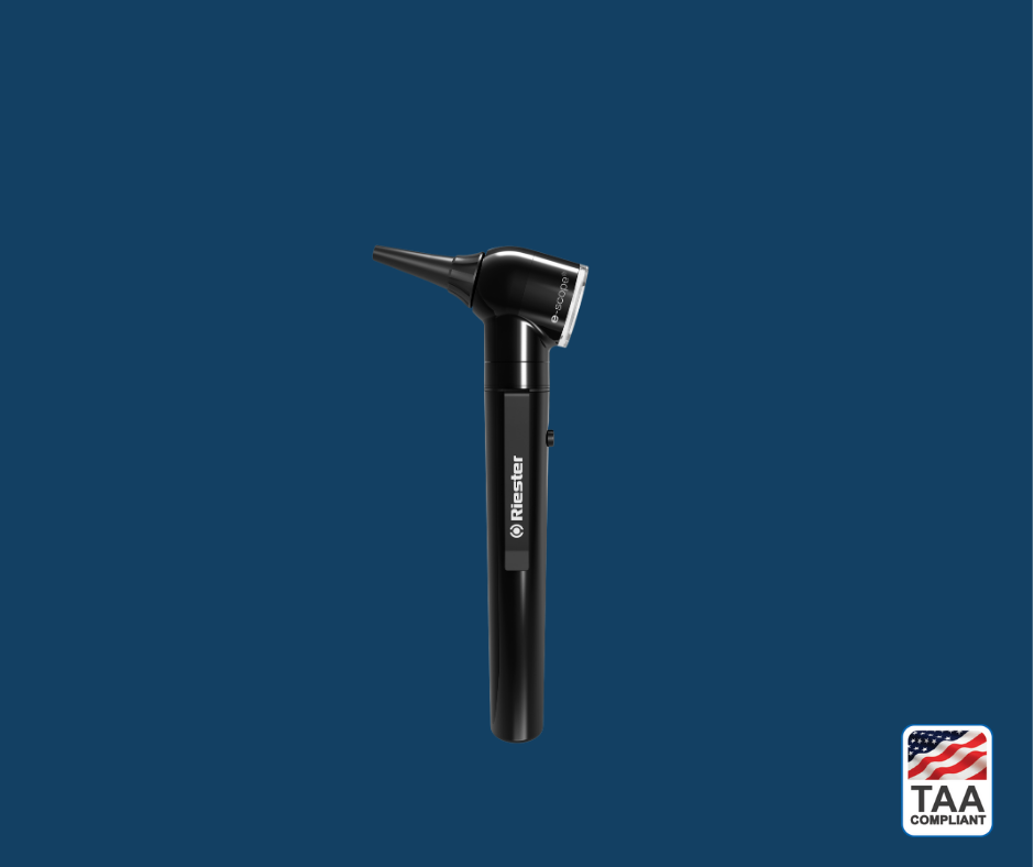 • Fiber optic otoscope with bright LED illumination, housed in a protective black case.