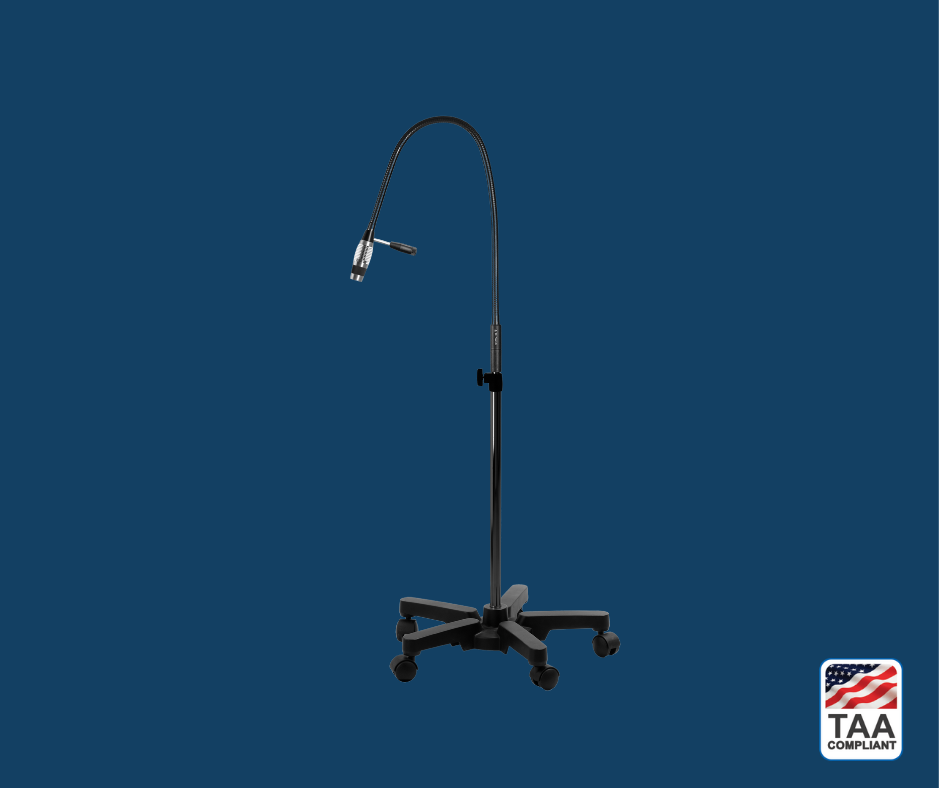• Mobile LED exam light with integrated power pack and rolling stand.